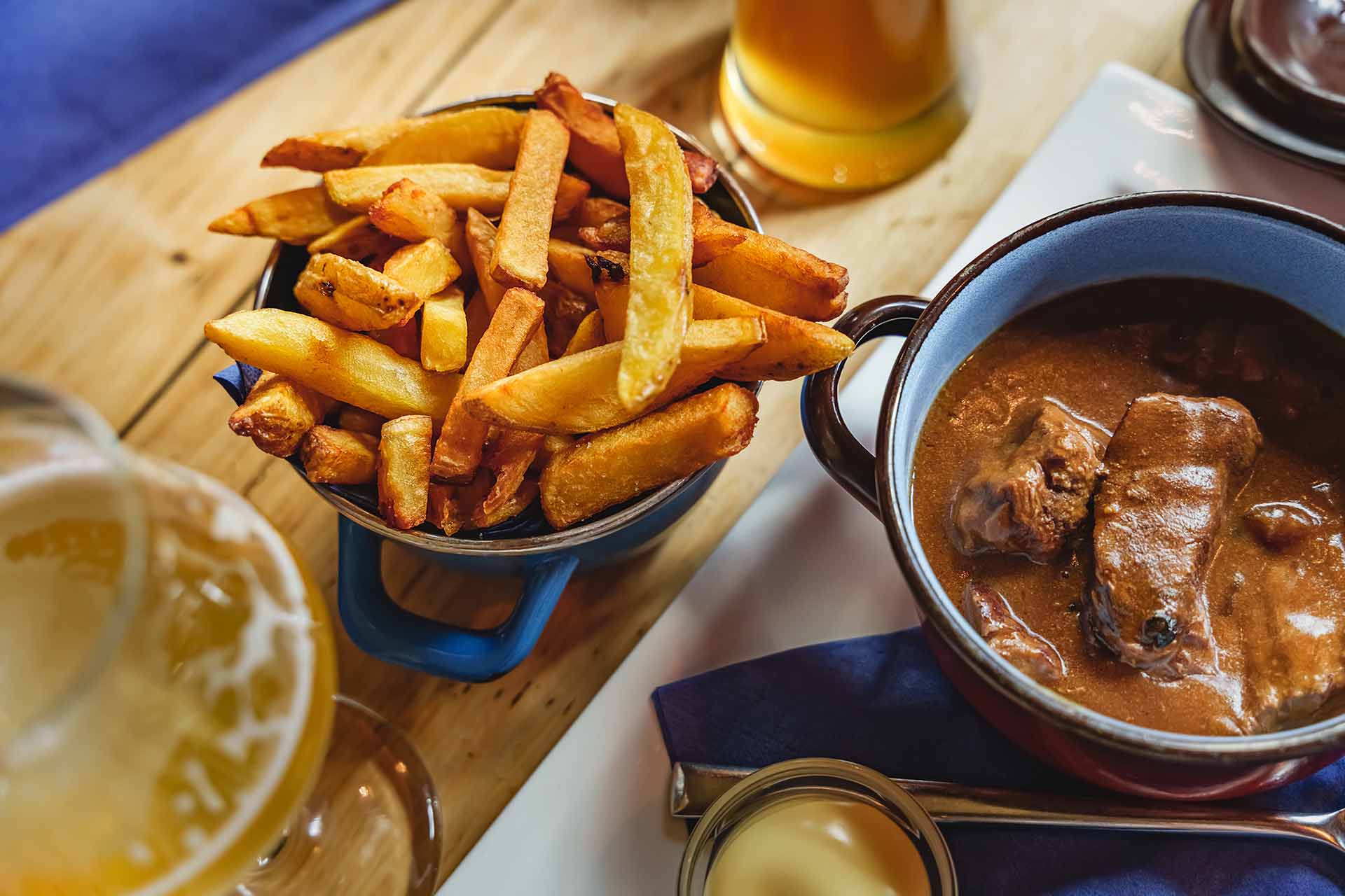 Voor slechts €24 krijg je ons huisgemaakte stoofvlees, geserveerd met frieten, sla en een drankje naar keuze (pils, frisdrank of wijn). Heerlijk comfortfood voor de perfecte maandag!